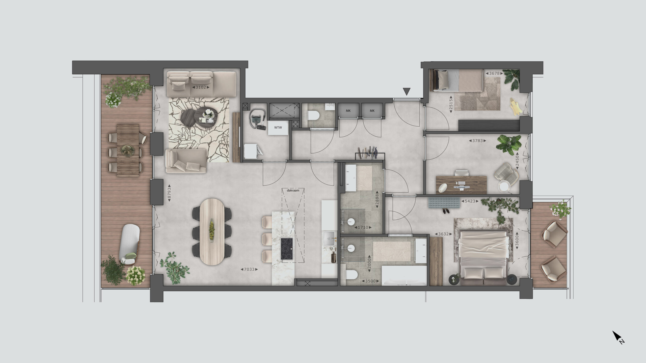 - Buitenruimtes: ca. 23 m² verdeeld over 2 terrassen