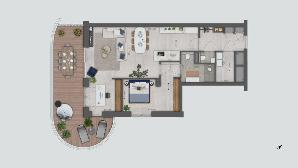 Het uitzicht vanaf het flinke terras, ca. 27 m², combineert de sfeervolle gezelligheid van het plein met de rustgevende uitgestrektheid van de zee. Hier geniet u in de ochtend en in de middag van de zon, een heerlijke plek om met een ontbijtje de dag te beginnen. U betreedt het terras van dit 95 m² grote appartement vanuit de woonkamer die met de eetkamer en open keuken een geheel vormt. Naast de woonkamer bevindt zich met een open verbinding nog een ruimte die geschikt is als werkkamer of bibliotheek en die ook toegang biedt naar het terras. Vanuit de woonkamer betreedt u ook de slaapkamer die direct is verbonden met de badkamer, voorzien van een douche en een privétoilet. Achter de keuken bevindt zich de entree met ruimte voor een garderobe, een separaat toilet en een inpandige berging.